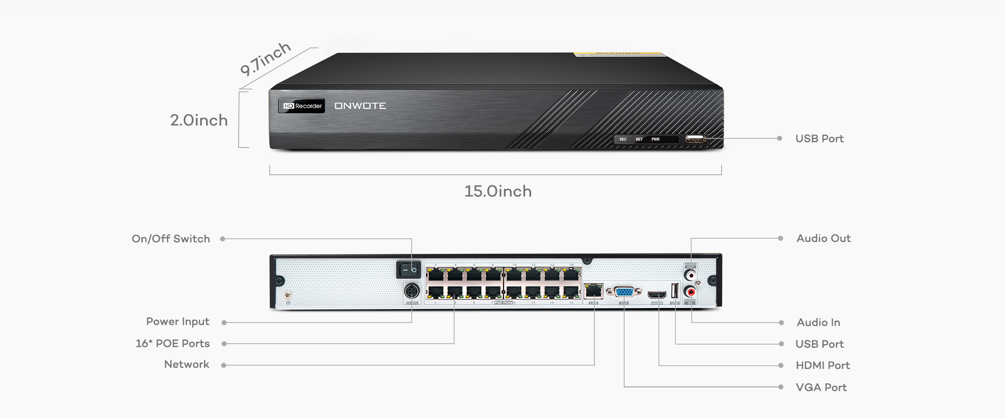 380mm×268mm×45mm (14.96"×10.55"×1.77"); Weight (without HDD): ≤3.17kg (6.99lb)