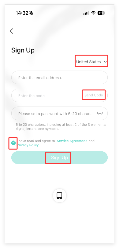 5. Select Region, enter your email address, check in I have read and agree to <<Service Agreement>> and <<PrivacyPolicy>> .Tap on Send Code.