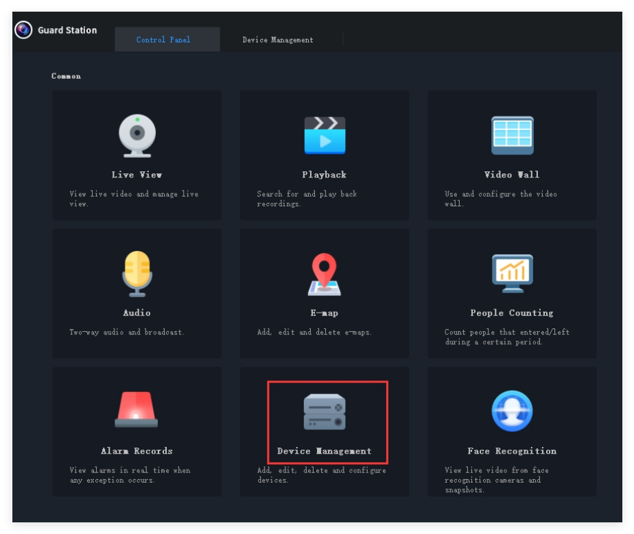 b. Login with the user you created. Go to Control Panel, click Device Management to add device.