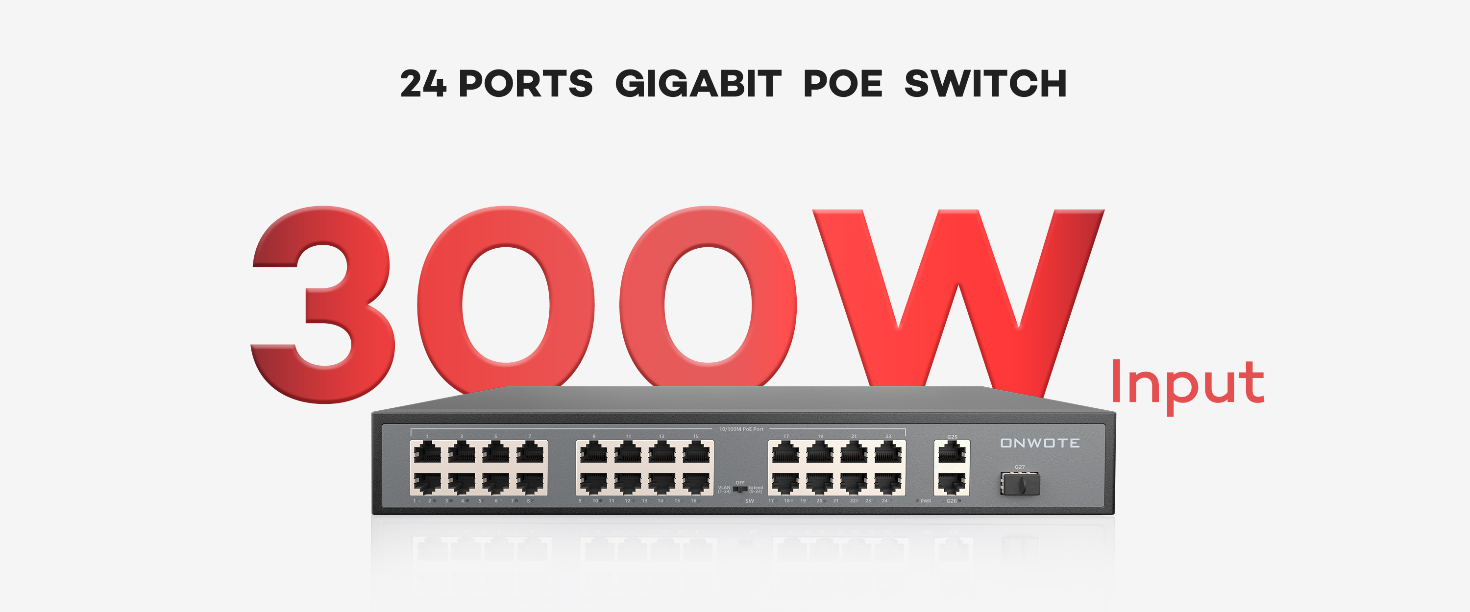 ONWOTE 24 Ports Ethernet PoE Switch @300W, 2X Uplink Gigabit RJ45 Ports, 1X SFP Slots, Support 4K 8MP 5MP 1080P IP Security Cameras, Add-on Injector to NVR System