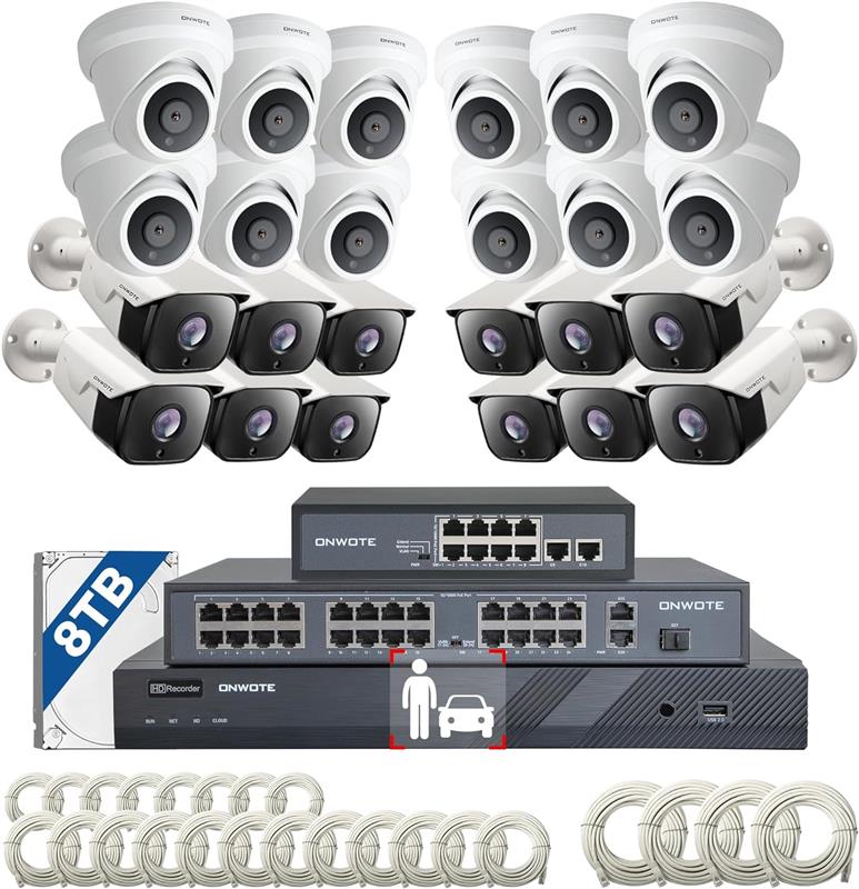 ONWOTE 4K 32 Channel Security Camera System PoE, 24x 8MP Outdoor Audio PoE IP Cameras, AI Human Vehicle Detection, 32CH 4K NVR 8TB, 32 Ports Switch, 24 Cables-2280ft, Commercial CCTV for Business