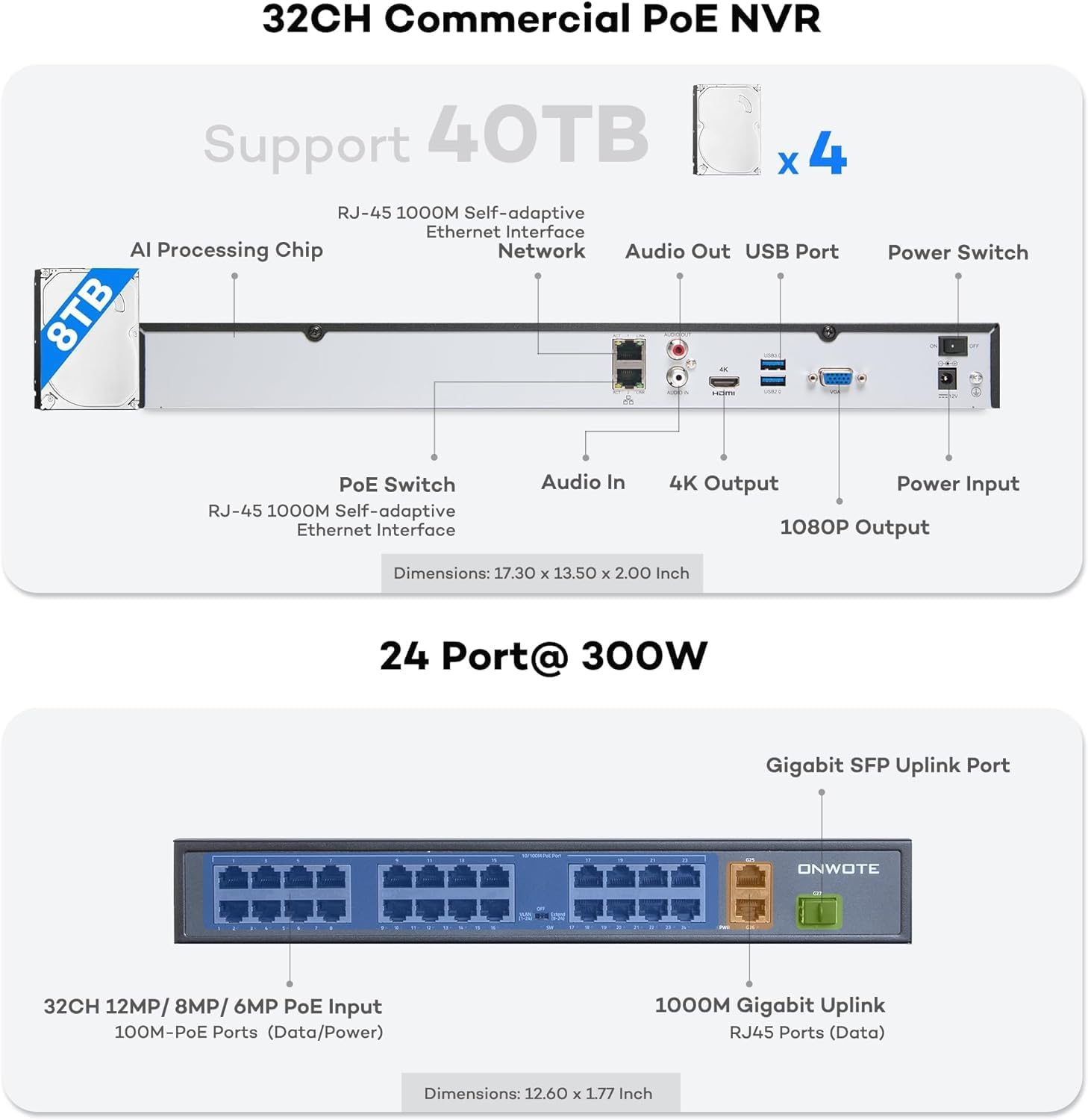 Built-in 8TB HDD with 40TB Storage Capacity-- Equipped with 8TB of built-in storage and the ability to support up to 40TB via 4 HDD ports for extensive video storage.
