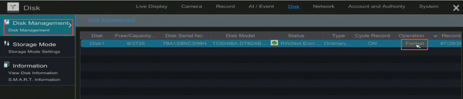 Step5:Move your mouse to the bottom left of your monitor, go to【Settings】-->【Disk】-->【Disk Management】, click【Format】to format the hard drive