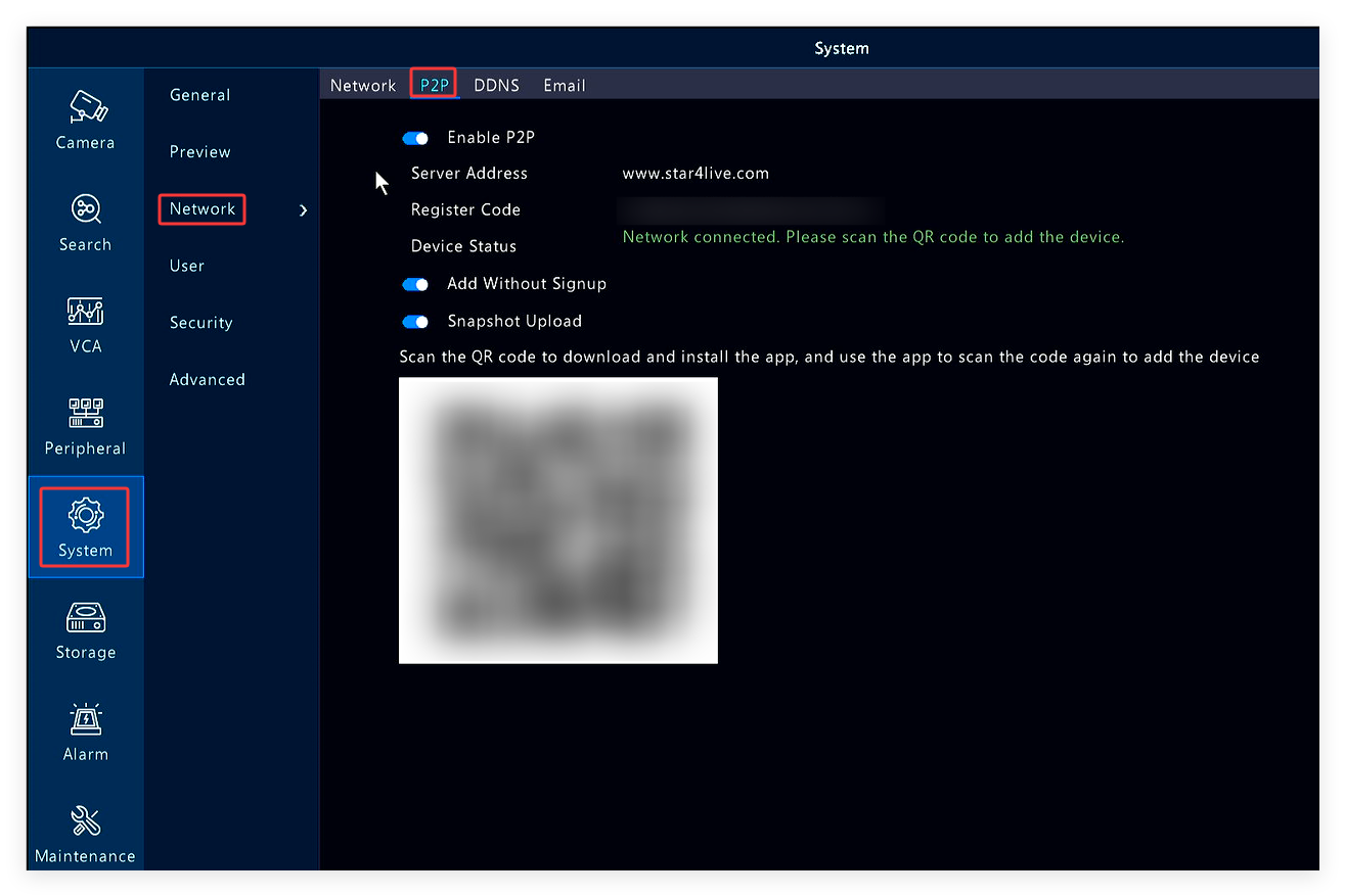 2. Find the device QR code on thebottom of the NVR. If you cannot find the QR code on the NVR, please right click your mouse on the NVR monitor, choose Menu-->System-->Network-->P2P to get theQRcode.