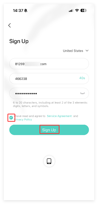 5. Select Region, enter your email address, check in I have read and agree to <<Service Agreement>> and <<PrivacyPolicy>> .Tap on Send Code.