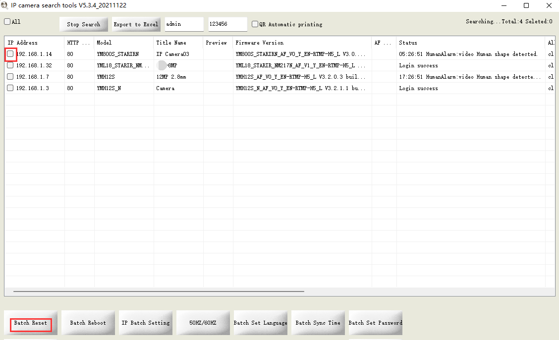 4. Check in your camera and click Batch Reset to Reset your camera. Please wait for about 3 minutes until the camera finished resetting.