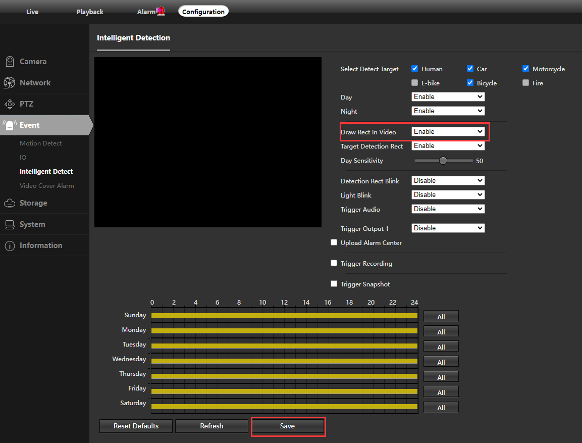 5. Choose Configuration—Event—Intelligent Detect, disable Draw rect in video, click on Save.