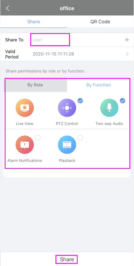 3. Type in the account or user, select the function, click Share to share the device.
