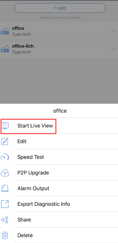 5. Slide down to Refresh, then the device will show up on Devices page. Please tap on the device and choose Start Live View to view video.