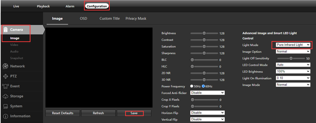 5.Choose Configuration—Camera—Image. Please change Light Mode to Pure Infrared Light to have a try.