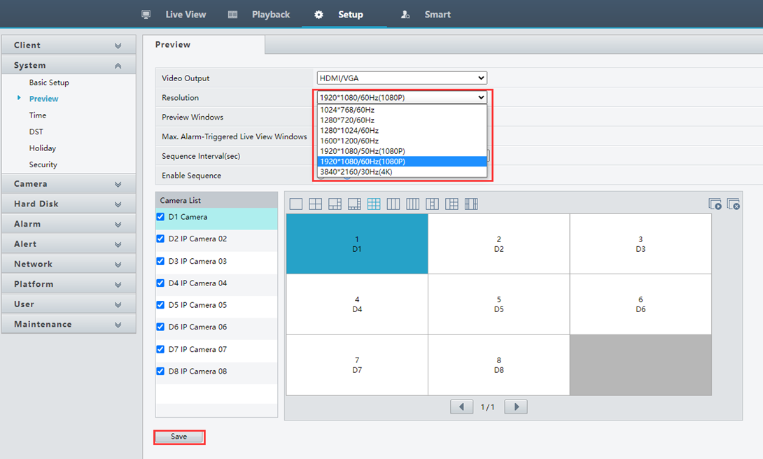 4.Please go to Setup—System—Preview to change Resolution to the same with the monitor you use. Then click on Save. This resolution will only change NVR output resolution, won’t change live video/ recording resolution.