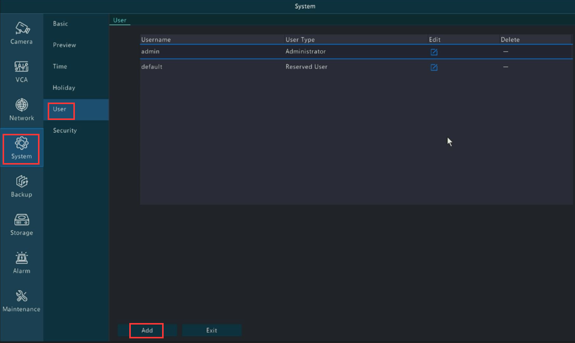 1. Plesae right click your mouse and choose Menu--System--User. Click Add on the bottom.