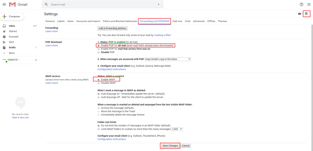 1. Please login your Gmail and go to go to Settings --> Forwarding and POP/IMAP --> Enable POP and IMAP --> Save Changes.