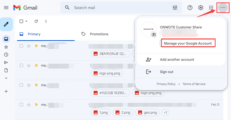 2. Click Google Account on top right corner, choose Manage your Google account.