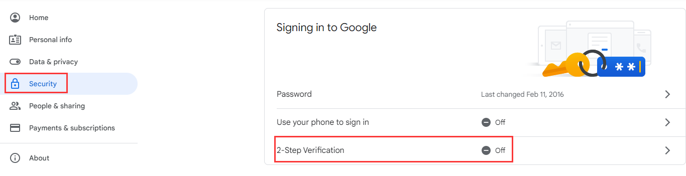 3. Click Security on left side. Click on 2-Step Verification and follow it to turn on 2-step Verification. (If you’ve enabled 2-step Verification jump this step.)