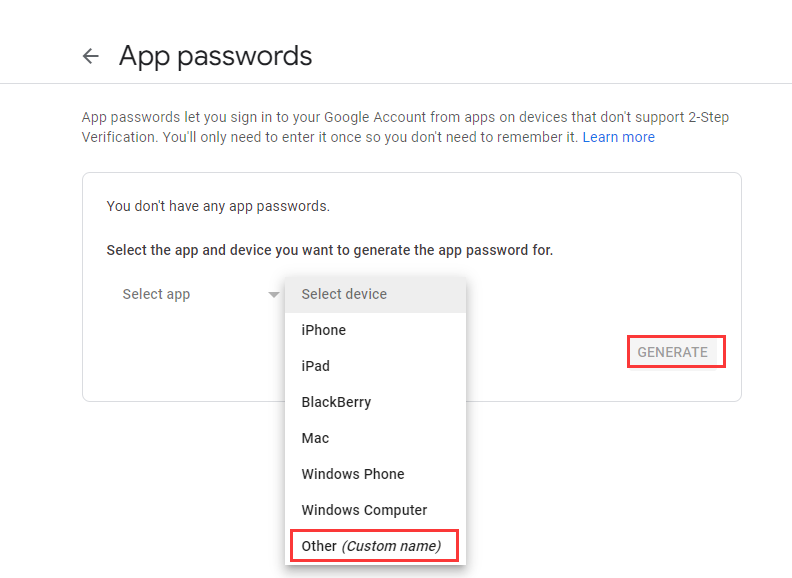 5. Click on App passwords. Click Select device, choose Other and set a name yourself. Then click GENERATE to get a APP password.