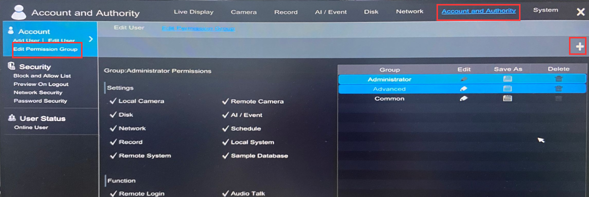 Please click on Start button on bottom left corner of the monitor, choose Setting—Account and Authorithy. Click Edit Permission Group under Account. Click + on the top right corner to add a group.
