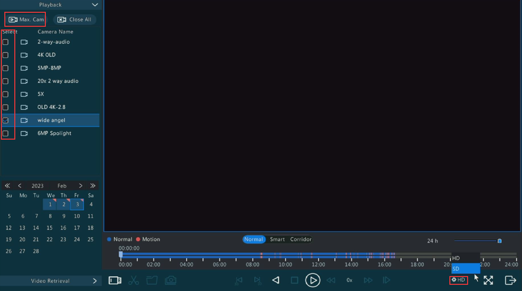 3. Clcik Max. Cams on top left or select the cameras you need to play video.