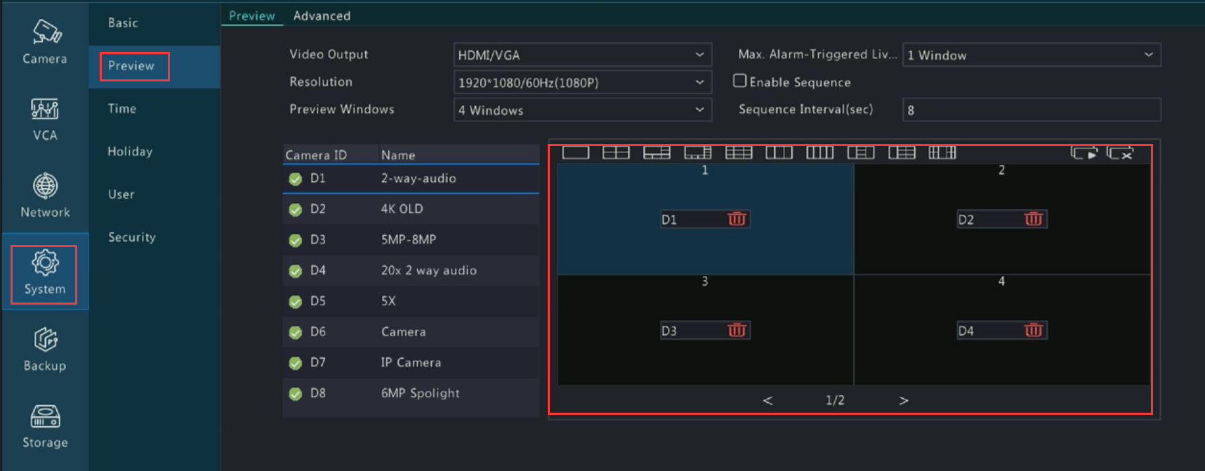 If your cameras are working properly and you can get video on phone/computer, but cannot get video on your monitor, please go to NVR Menu--System--Preview to