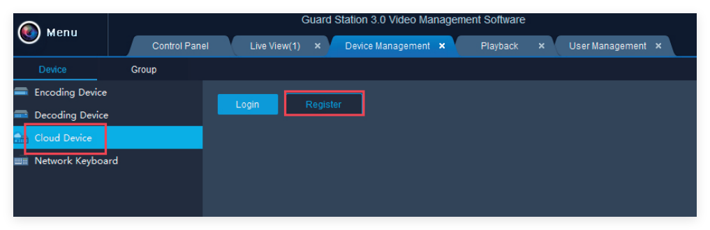 c. Click Cloud Device and Register to register a cloud account (If you've already registered an account on your mobile app-Elink Defense or GuardViewer, login with that account directly).