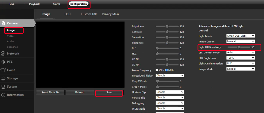 5. Choose Configuration—Camera—Image. Please change the Light Off Sensitivity higher, then click Save to save changes. The higher you change, the earlier your camera will change to day mode.