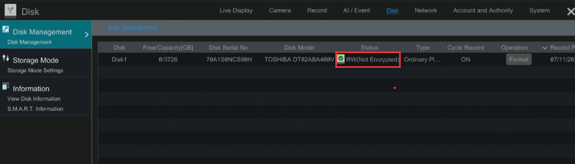 2. If hard drive status is RW(Not Encrypted). It means hard drive is working. Please go to Setting--Record to check your record settings.