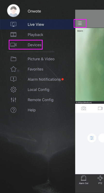 4. Login GuardViewer with the new account. Tap on the button on tope left and choose Devices.