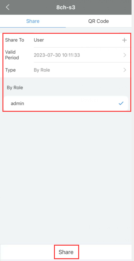 3. Type in the account or user, set Valid Period, change Type to By Role (if you don’t want to share admin authority, please follow this guide to add a new user for your system: http://onwote.com/Support/Detail/27), then choose a role, click Share to share the device.